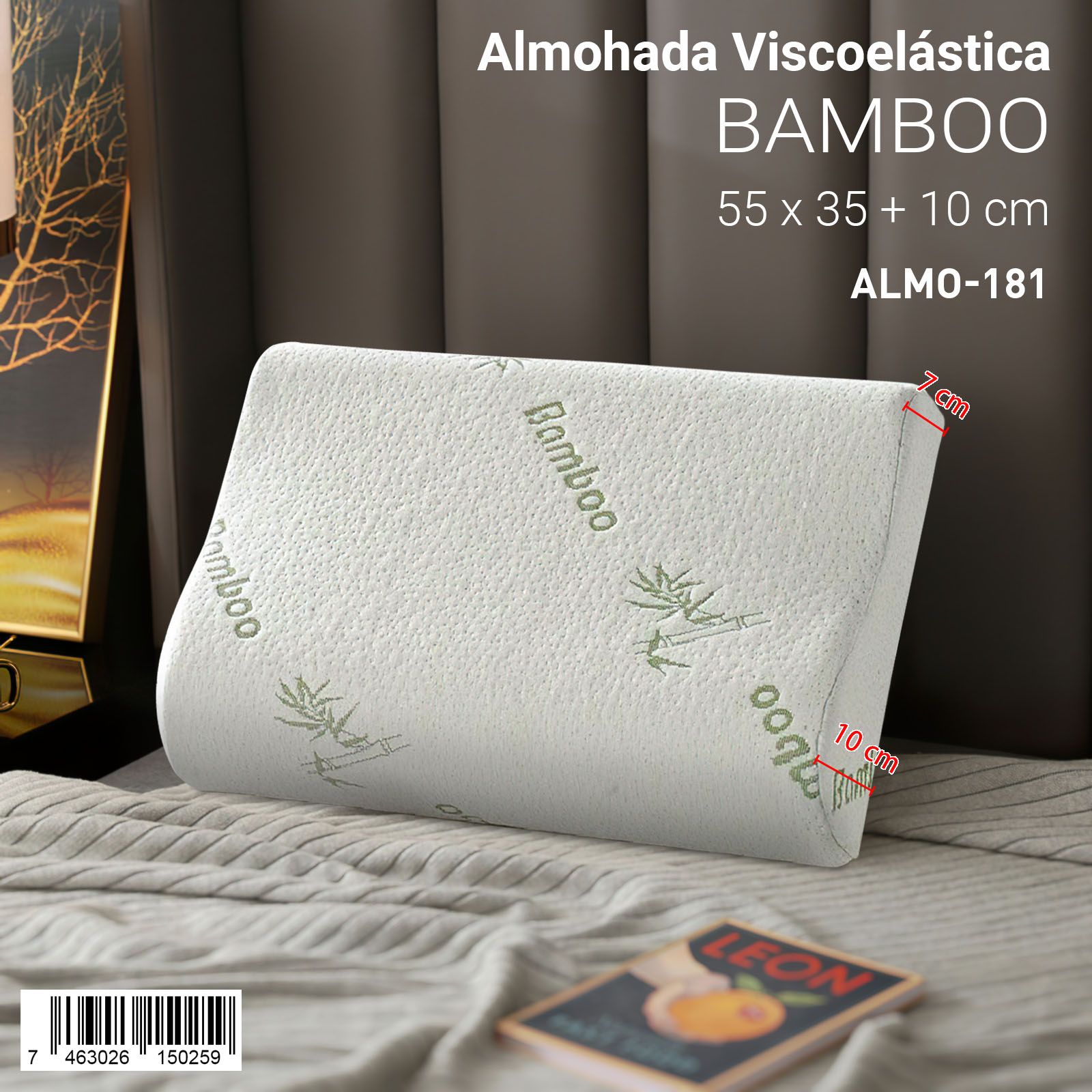 La Almohada Viscoelástica Bamboo está elaborada con espuma de memoria de alta calidad, que se adapta a la forma natural del cuello y la cabeza, proporcionando alivio en los puntos de presión y mejorando la postura al dormir. Su funda con fibras de bamboo es suave, fresca e hipoalergénica, ideal para un descanso reparador y saludable.