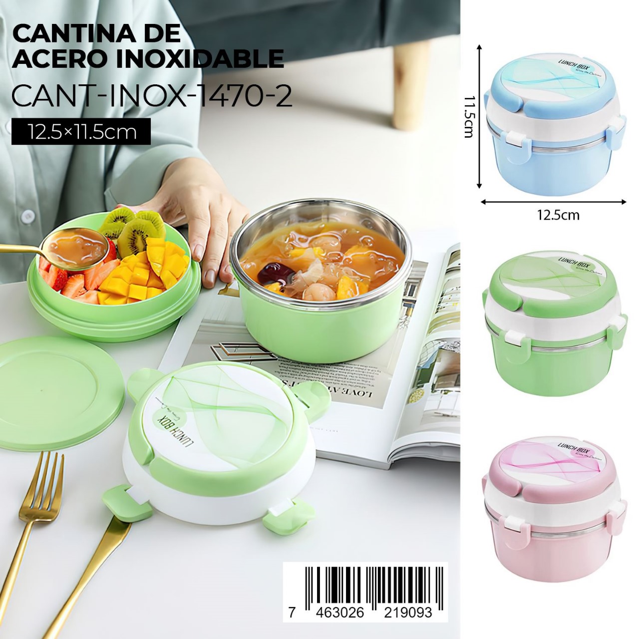 Lleva tus comidas favoritas a donde vayas con esta práctica cantina de acero inoxidable de dos niveles. Su diseño compacto y moderno incluye cierre hermético y tapa con seguro, ideal para conservar los alimentos calientes o fríos por más tiempo. Fabricada con materiales duraderos y fáciles de limpiar, perfecta para el trabajo, la escuela o salidas al aire libre.