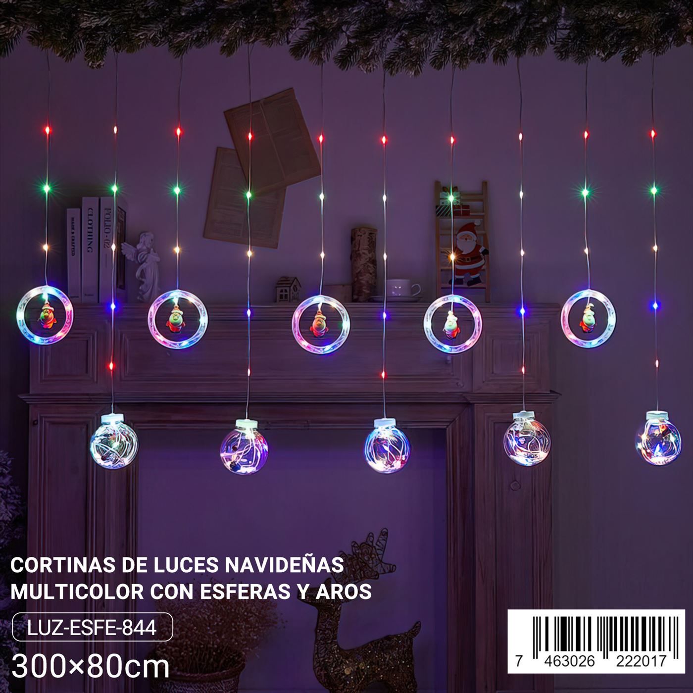 Cortina de luces navideñas multicolor con esferas y aros