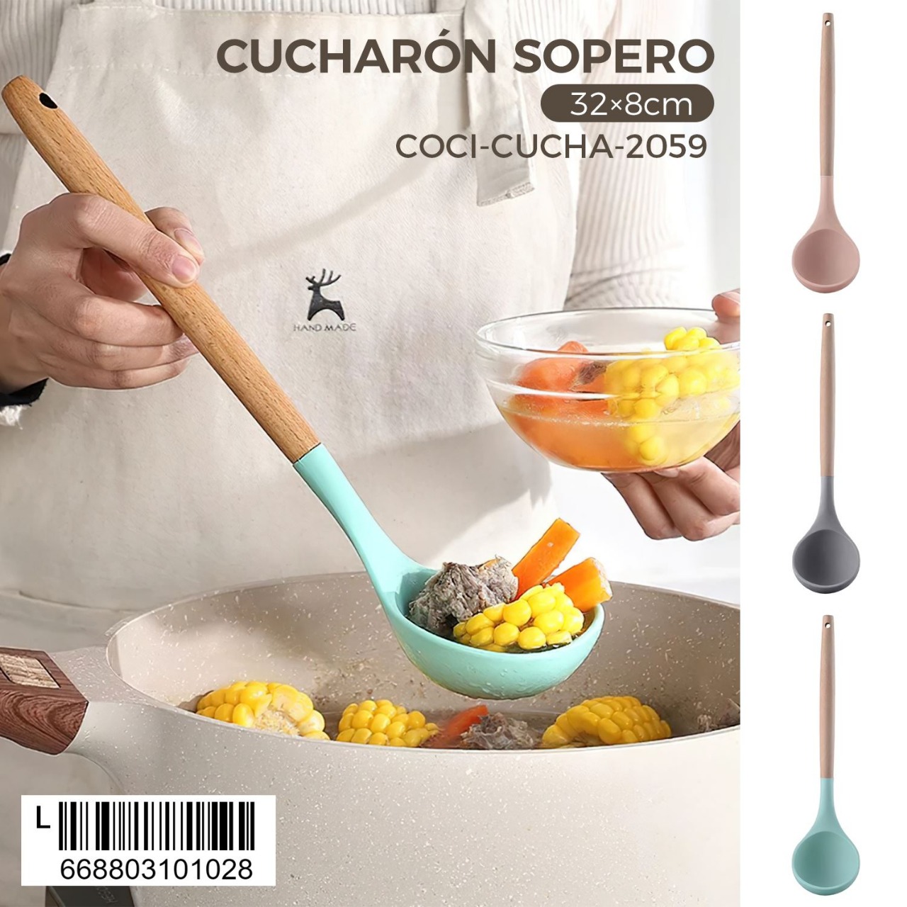 Cucharón sopero con mango de madera y cabeza de silicona, diseñado para servir sopas, caldos y guisos de manera cómoda y eficiente. Su tamaño y forma permiten recoger una buena cantidad de líquido y sólidos sin derrames.