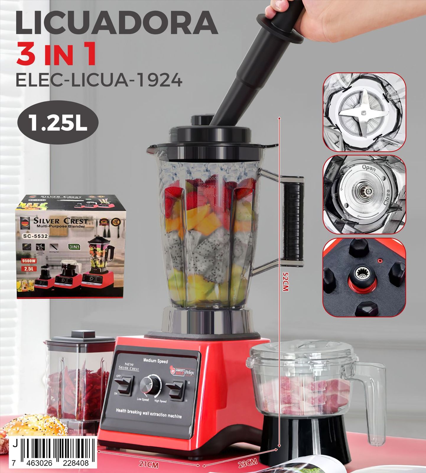 Licuadora 3 en 1 con capacidad de 1.25 litros, base robusta en color rojo y negro, ideal para preparar jugos, batidos y picar alimentos con accesorios incluidos.