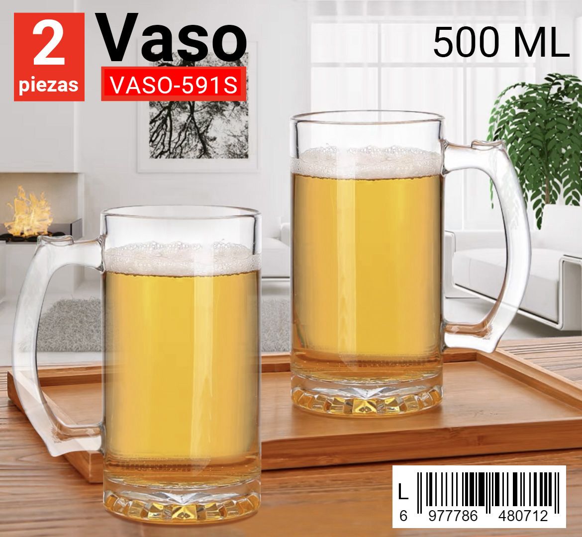Vaso tipo jarra de vidrio con diseño clásico y asa ergonómica, ideal para disfrutar de bebidas frías como cerveza o jugos. Su capacidad de 500 ml es perfecta para un servicio generoso y cómodo.